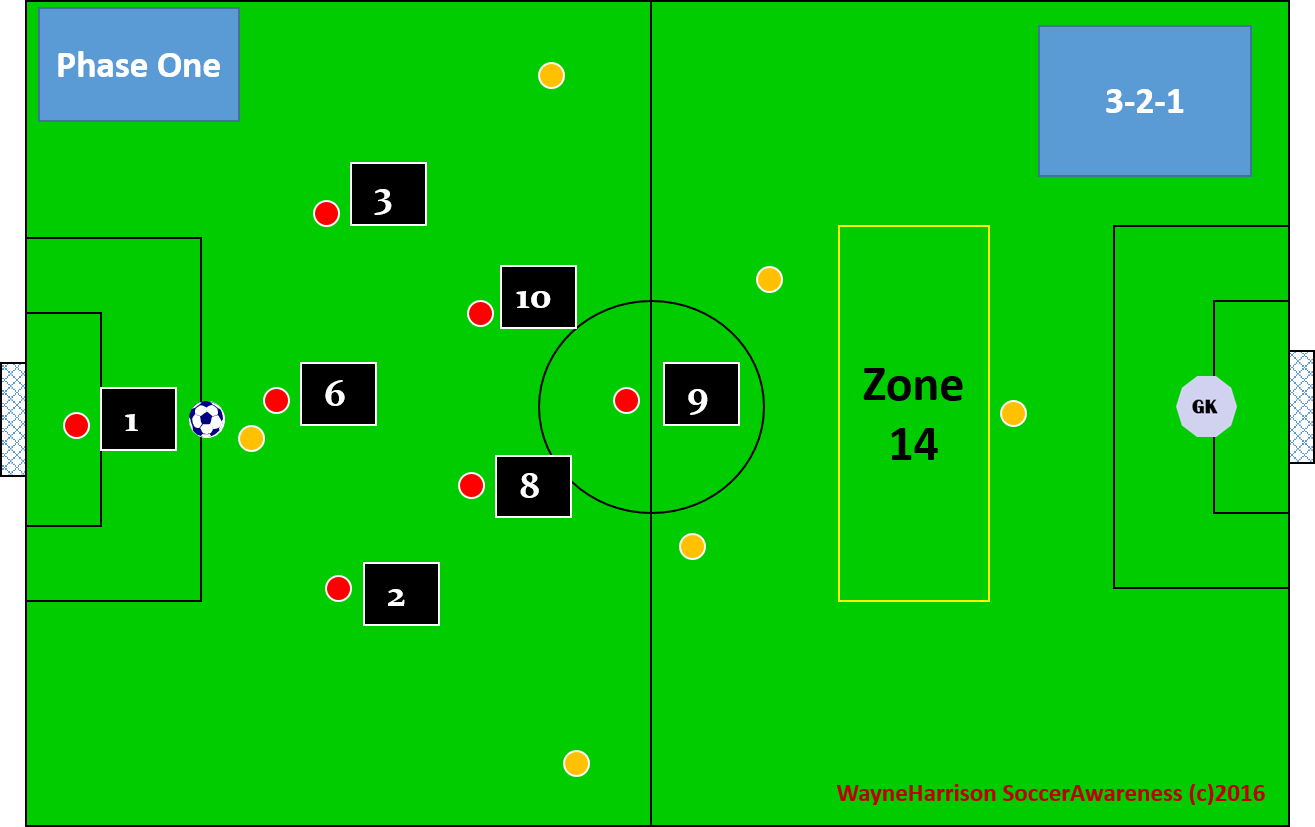 Using Cones as reference points for team shape defensively then team shape offensively. This is the team shape start position of a 3-2-1.